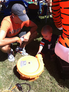 Yesterday started Jack's second season of Auburn football. He's been forced to prepare for it since last season ended, so I'm sure he was very excited. He's been practicing his "Touchdown Auburn!" (hands straight up in the air), clapping during the Auburn fight song, and pitching a fit when we ask him, "What do we do when Alabama scores?" :-)